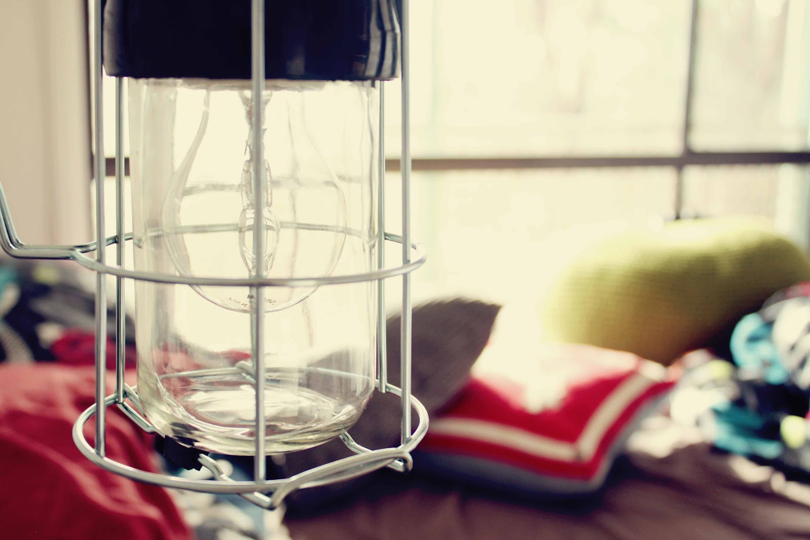 For his bedside lamp, I picked up this cheap shed work light from Bunnings & hung it from a hook from the ceiling.